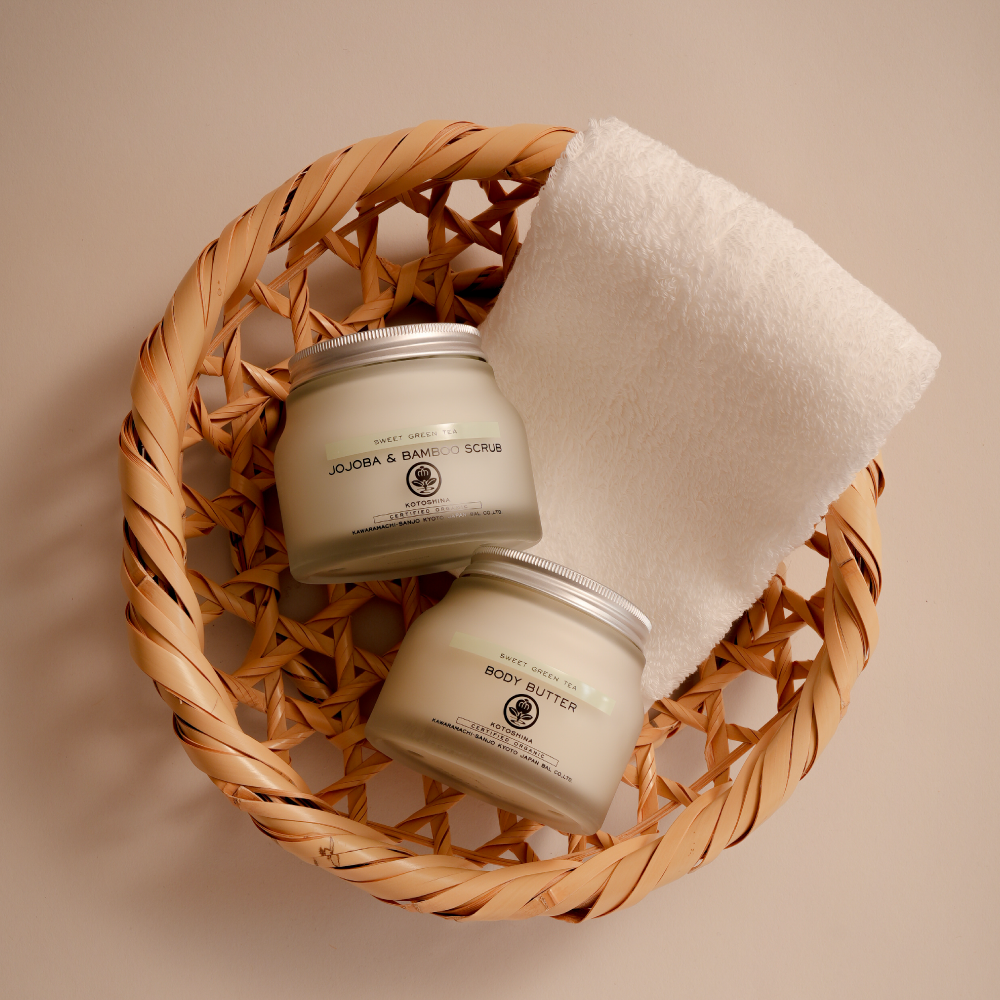 バンブースクラブで不要な汚れをやさしく落とし、ボディバターでしっとりと包み込むように整えます。